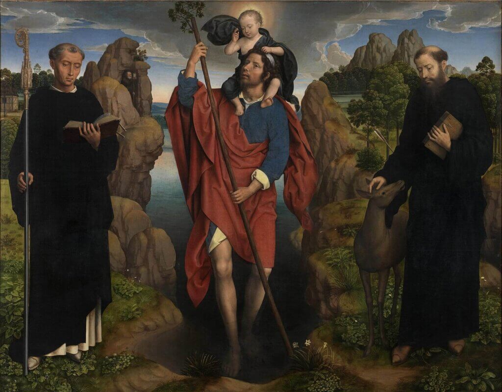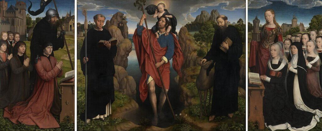 Prawdopodobnie to właśnie dlatego Tryptyk Moreelów tak bardzo różni się od dotychczasowych prac Memlinga. Opracował na potrzeby tego zlecenia zupełnie nową formułę przedstawienia świętych i fundatorów, aby zapewnić sobie przychylność zleceniodawców. Wygląda też na to, że bez mrugnięcia okiem spełniał ich różne zachcianki. Jedną z nich było zapewne umieszczenie w centrum świętego Krzysztofa. Różnie interpretuje się ten wybór – moja ulubiona teoria wiąże go jednak ze strachem przed represjami ze strony księcia Maksymiliana. Moreelowie nie należeli do jego zwolenników, tymczasem święty Krzysztof uchodził wówczas nie tylko za patrona podróżnych, ale także wszystkich tych, którzy obawiali się nagłej śmierci. Powszechnie wierzono, że ten, kto ujrzy danego dnia jego wizerunek, nie umrze nagle bez spowiedzi. Święty Krzysztof był więc wprost wymarzonym opiekunem dla rodziny, która realnie bała się o swoją przyszłość.