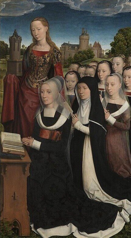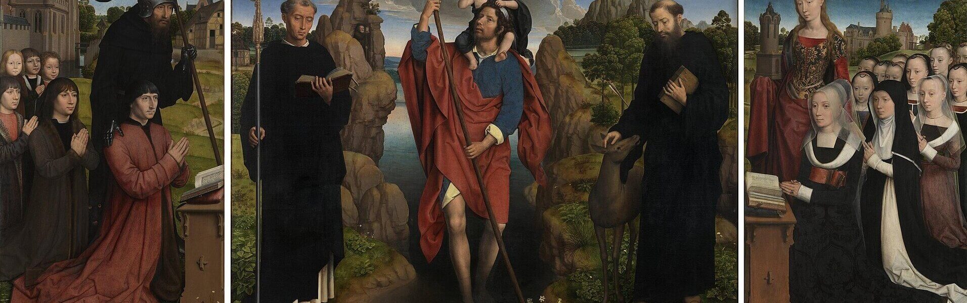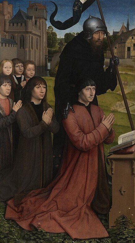 Nadal nie są to wszyscy święci obecni na tym obrazie. Kolejnych odnajdziemy na bocznych skrzydłach i tym razem są to po prostu imienni patroni fundatorów. Klęcząca postać na lewym skrzydle to Wilhelm Moreel – towarzyszy mu święty Wilhelm z Maleval, którego rozpoznajemy po długiej lancy i smoku. Ten ostatni jest ledwie widoczny, ale jeśli dobrze przyjrzycie się świętemu, dojrzycie za nim dwa żółte ślepia. Na pierwszy rzut oka wyglądają jak oczy pantery, ale gadzi ogon wijący się u stóp świętego Wilhelma zdradza, że chodzi o smoka.