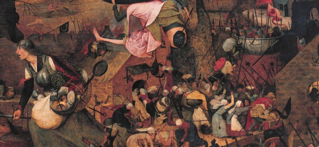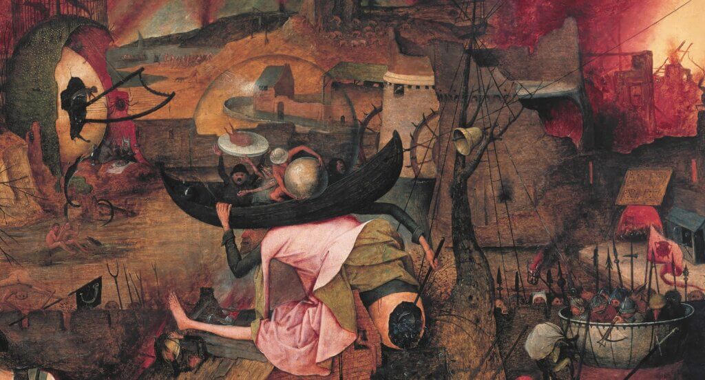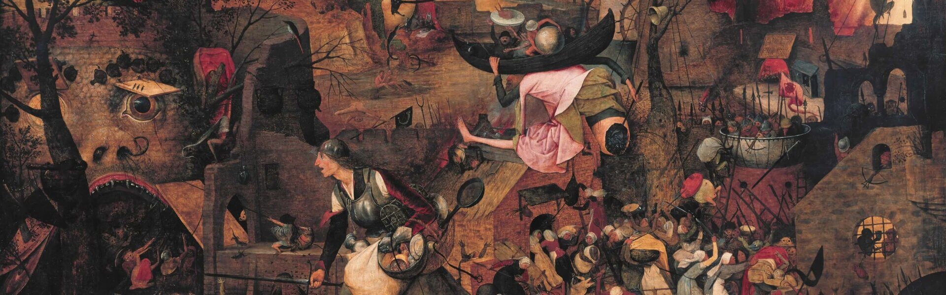 Jeśli chcemy, możemy iść o krok dalej i uzupełnić te wątki o kontekst polityczny. Obraz powstawał w niełatwych dla Niderlandów czasach, które pokrótce zarysowałam już w odcinku o Rubensie. Było to stulecie krwawych wojen na tle religijnym, którym towarzyszyły okrutnie stłumione powstanie Flamandów przeciw władzy Hiszpanii oraz liczne bunty chłopskie. Nie można więc wykluczyć, że apokaliptyczne obrazy Bruegla narodziły się w jego głowie wtedy, gdy na własne oczy obserwował te okropności.